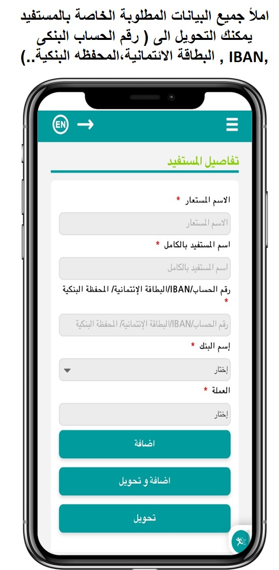5. ثم املأ جميع البيانات المطلوبة وقم باضافة رقم الحساب / IBAN فى الجزء المخصص لحساب المستفيد.