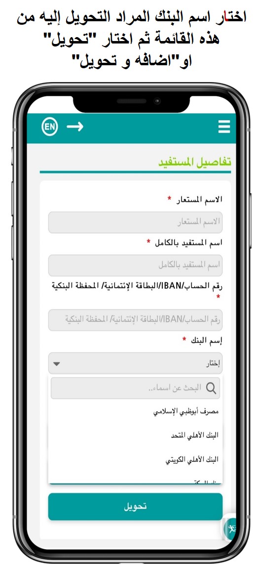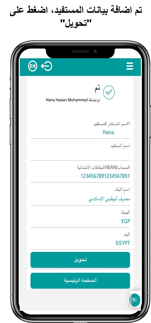 6. اضغط تحويل أو “حفظ وتحويل” لحفظ بيانات المستفيد للتحويل فى المستقبل.