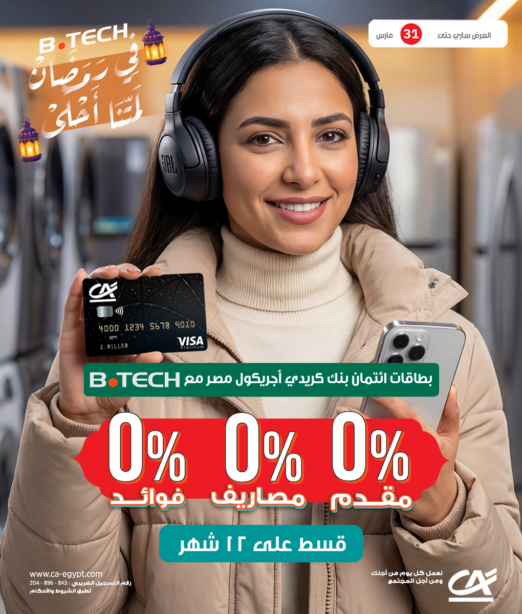 عشان رمضان لسة معانا وعيد الأم وعيد الفطر جاى علينا اشترى ببطاقات ائتمان كريدي أجريكول من  B.TECH و استمتع بعروض التقسيط علي 12 شهر بدون فوائد , بدون مصاريف ادارية , بدون مقدم  خلال شهر مارس 2026.